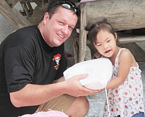 Sopin Thappajug (right) presents healthy treats to the youngsters.