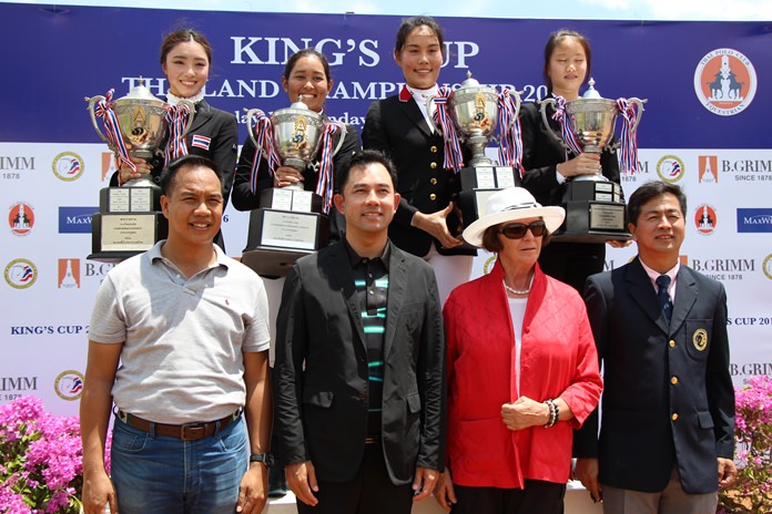 Former Pattaya mayor Ittipol Khunplume was on hand to present Kings Cup trophies to the winners on Sept. 18. Successful in the four main disciplines were Rawischa Vechakorn (Dressage), Jaruporn Sompichart (Jumping), Areenata Cahwathanon (Eventing) and Patcha Sawatkijthanrong (Endurance).