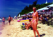 Now stand where you would usually take this type of photo and look through the viewfinder. Start walking towards Aggie looking through the viewfinder all the time. Stop when she begins to " fill the frame". She has now become the major feature inside the frame-up lines in the viewfinder. Take that shot - you now have a perfect picture of Aunt against a brightly coloured background of waving beach umbrellas and the Gulf of Siam.