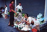 their alms from food vendors and passers-by. I watch as a businesswoman offers