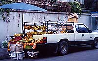 the street a woman sells fruit from her pickup truck, and the bed overflows