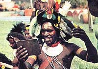 An Enga tribesman wears a harlequin-like guard mask,