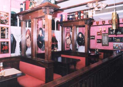 railings, an exit to the accommodation upstairs, and booths around the