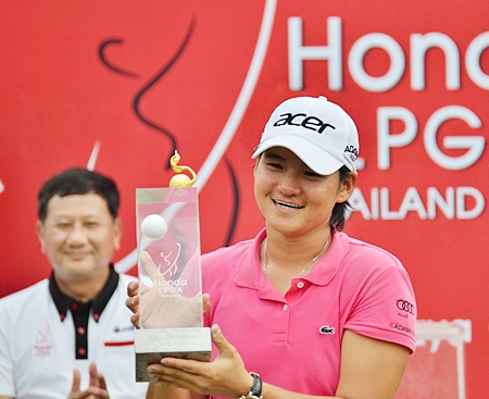 World No.1 women’s golfer Yani Tseng from Taiwan holds up the Honda LPGA Thailand 2012 trophy after a superb final round 66 at Siam Country Club Old Course on Sunday gave her back to back victories in the event.