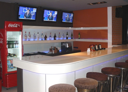 air-conditioning and a huge horseshoe bar and large screen television sets