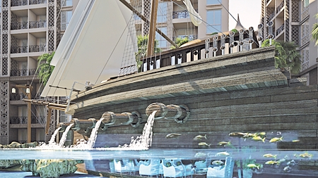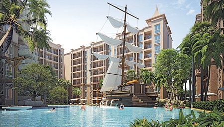 Atlantis unit prices start from 1.3 million baht for 34.5sqm one bedroom units, up to 4.9 million for a 69sqm, 2 bedroom unit; all fully furnished. Facilities include a lagoon swimming pool featuring a full size wooden galleon that is the clubhouse and sundeck plus five Jacuzzis, waterslides, children’s submarine playground, a huge waterfall and wooden footbridge across the 2,600sqm pool.
