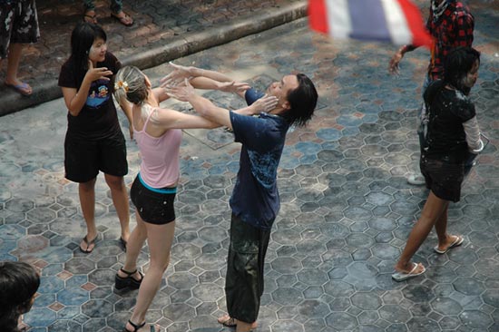A westerner puts watery power on a Thai man as they enjoys the traditoinal water festival in Pattaya on April 19th.