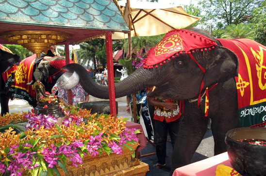 Water splashing and respect paying to the Buddha by tourists and the jumbos, what a great fun and a high pressure day at the Nong Nooch Garden, Sattahip