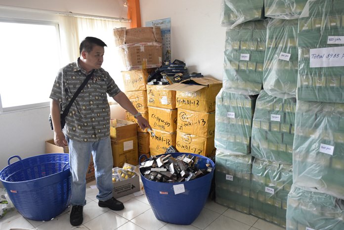 Police from Chonburi, Pattaya and Nongprue stations swooped in on locations on Soi Mabyailia 31, Soi Paniadchang and Soi Prapanimit 16 July 13, detaining more than 200 owners and employers for questioning and seizing hundreds of boxes of suspected contraband.
