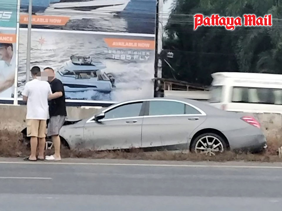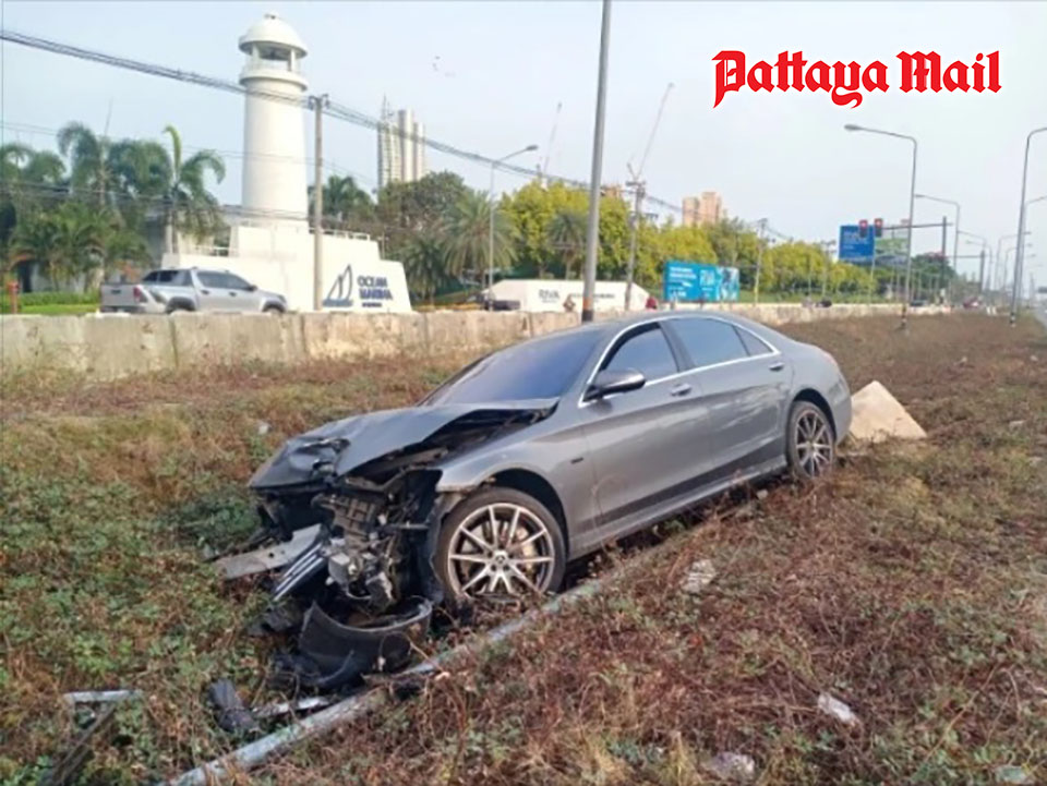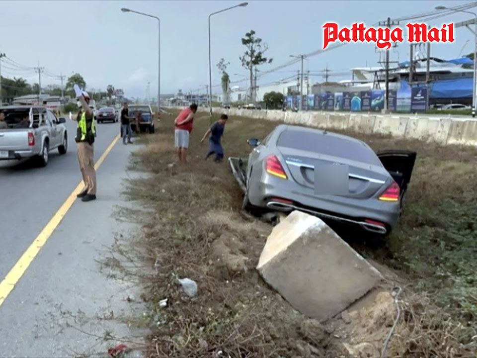 PATTAYA, Thailand – A Chinese national driving a Mercedes-Benz S-Class with an auctioned license plate ran a red light at the Sukhumvit intersection heading towards Highway 7 in Pattaya. The vehicle lost control and crashed into a median light pole, snapping it in half. The driver and a passenger fled the scene, but security cameras captured the entire incident. Police are now tracking them down for legal action.