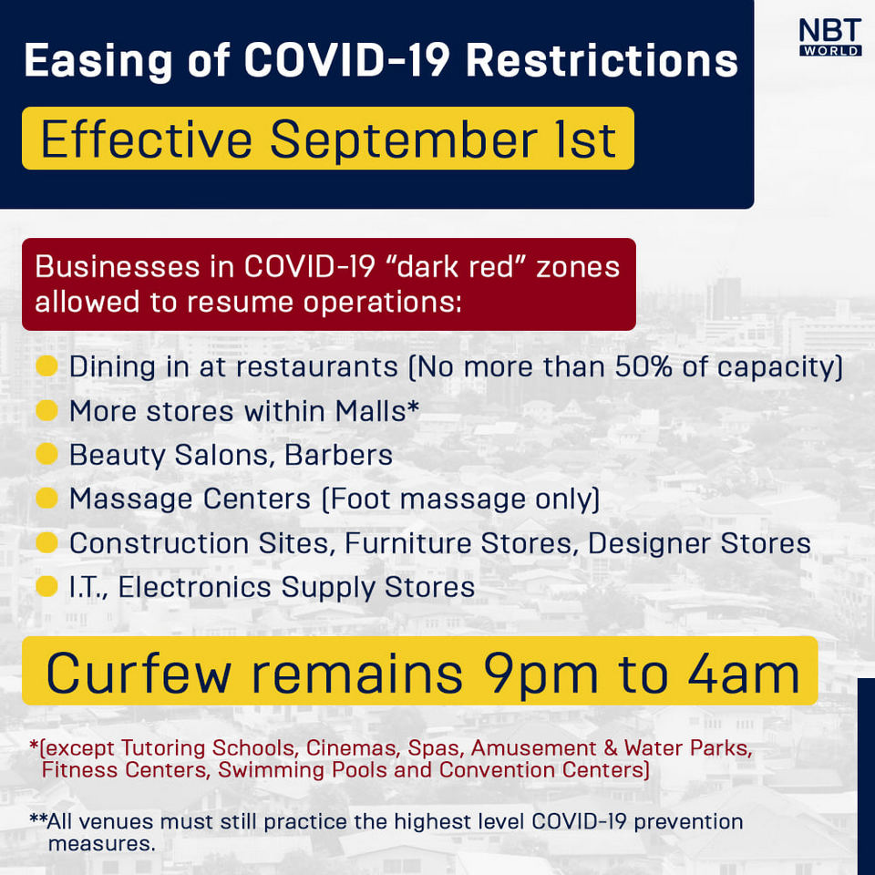The Center for COVID-19 Situation Administration (CCSA) has eased some restrictions in provinces which are categorized as “dark red”, to allow for businesses to resume operations conditionally from September 1.