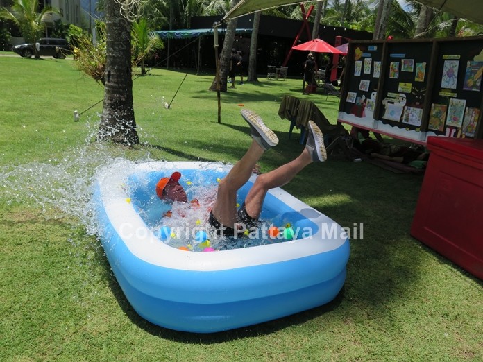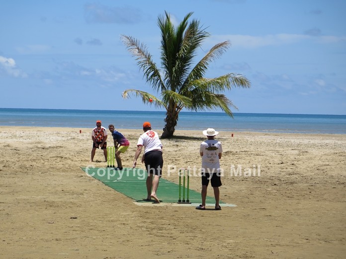 It would be appropriate here to explain some of the intricacies of the scoring and rules. Six batsmen would each face one over of five balls (to save time). Each player would bowl one over and occupy each fielding position. Each time the batsman ran halfway up the wicket and back, he would score one run. 4’s and 6’s as normal. He would score 12 runs if he could get the ball into the Shambala Resort swimming pool or through a hole in a cardboard cut-out of Frank’s bottom! (Don’t ask). If he was out, he’d lose 5 runs. The bowler would be penalised 2 runs for each no-ball or wide and 4 runs and 6 runs for successive errors. The secret is not to give away extras or lose wickets.