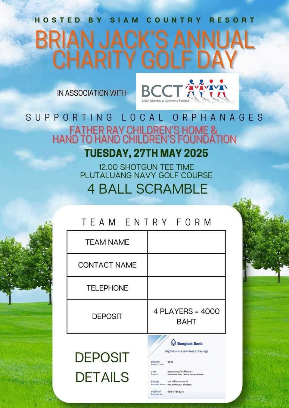 BCCT is delighted to be seeking sponsorship of Brian Jack’s Annual Charity Golf Day on Tuesday 27th May 2025. The venue is Plutaluang Navy Golf Course.