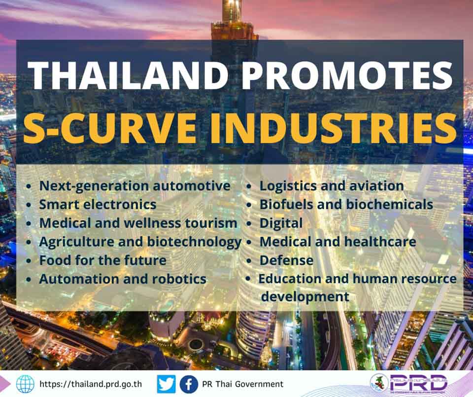 The 12 targeted S-Curve industries are automotive; smart electronics; affluent, medical, and wellness tourism; agriculture and biotechnology; food; robotics for industry; logistics and aviation; biofuels and bio-chemicals; digital; medical services; defense; and education and human resource development.
