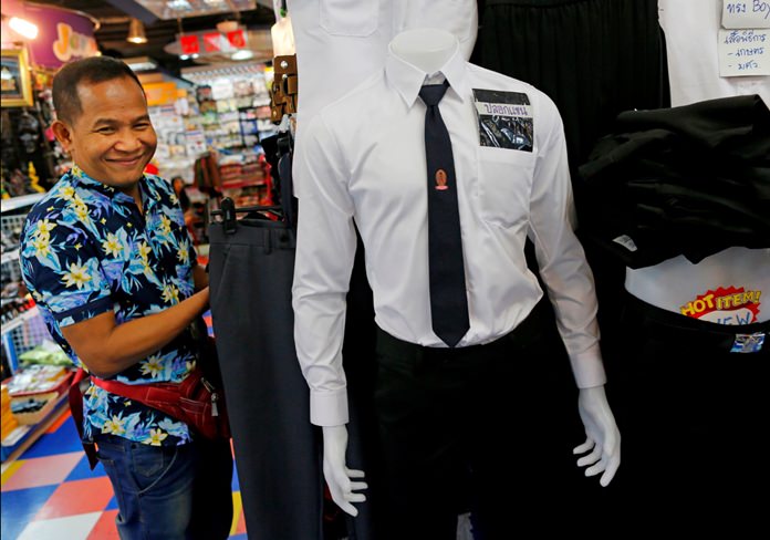 Bangkok (AP) — Tucked in his cramped clothing stall in an enormous Thai mall, Pirumchai Asiram sits on a plastic chair flanked by two worlds — bright, vibrantly colored shirts and dresses to his right, neat stacks of somber apparel in blacks and whites to his left. Ask him which sells better, and he’ll smile.