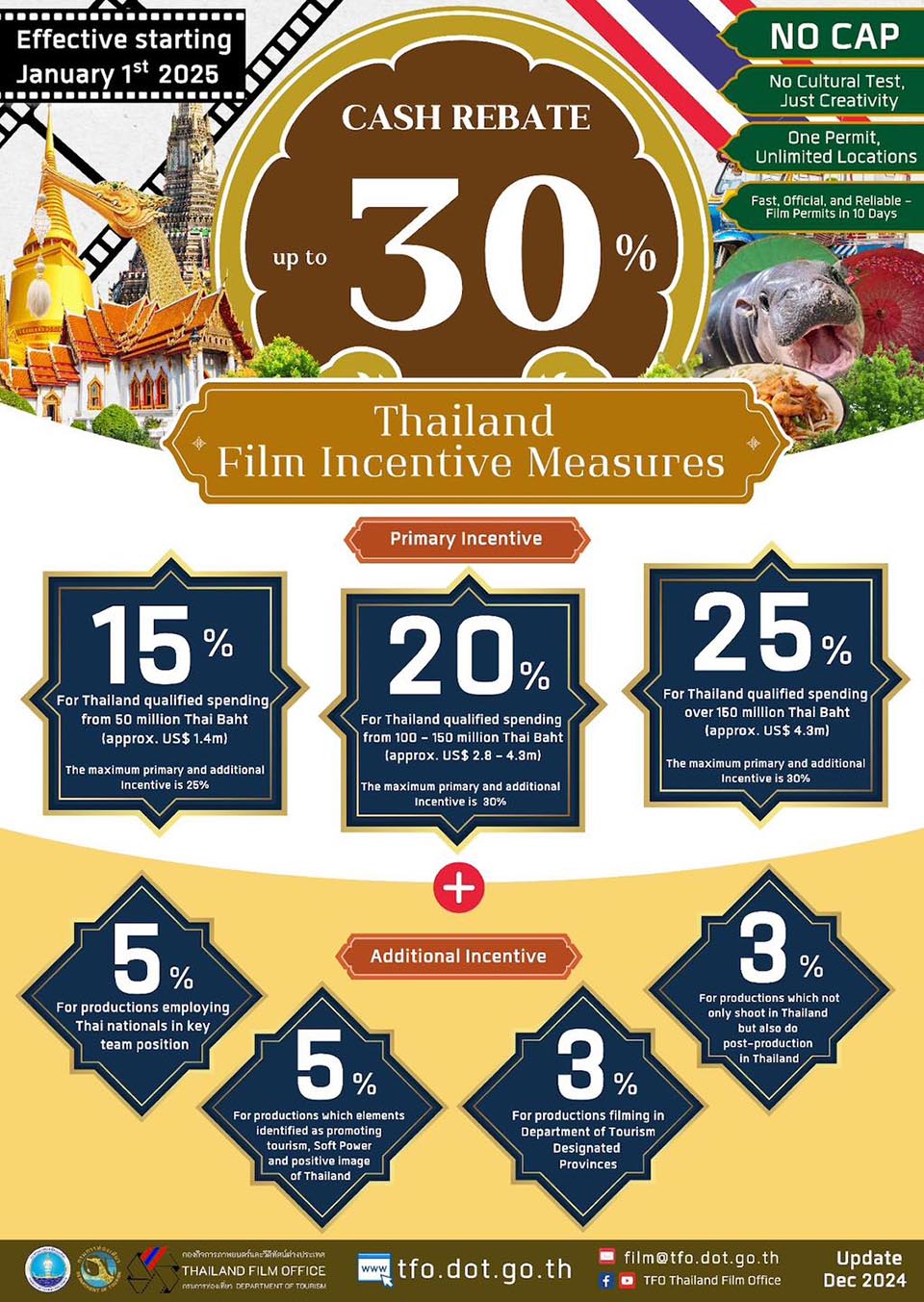 The updated programme provides a tiered rebate system based on spending levels in Thailand. Productions spending at least 50 million Baht are eligible for a 15% rebate. For spending between 100–150 million Baht, rebates increase to 20%, while expenditures exceeding 150 million Baht qualify for a 25% rebate. The maximum rebate cap is 30%, inclusive of additional incentives.