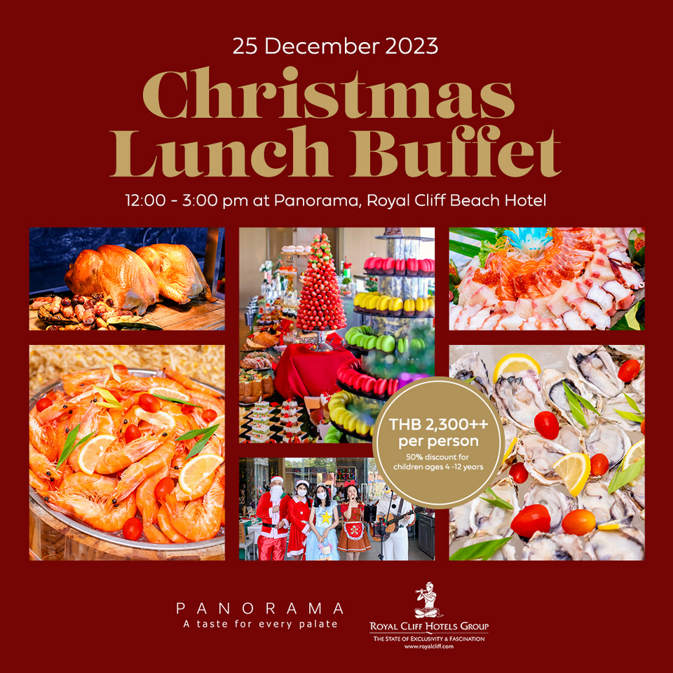 Spoil your family and friends with a magnificent feast to celebrate Christmas day on 25 December 2023 by joining Royal Cliffโs phenomenal โChristmas Lunch Buffetโ at Panorama restaurant. Look forward to an outstanding selection of festive culinary delights and bountiful treats for only THB 2,300++ per person. An appearance from Santa himself with his bag of goodies along with the hotelโs talented resident musical duo will add a little festive cheer! (50% discount for children ages 4-12 years).