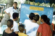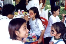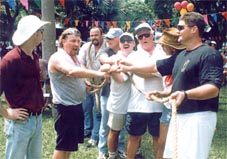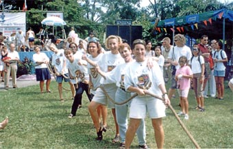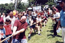 ready to promote and accept �family� lifestyle values? By Saturday lunchtime it was totally obvious that the event was a success, with over 1,500 paid adults in attendance by that stage, plus at least the same total of free entry children. The faces of the organising group were wreathed in smiles, and in a couple it was even stunned amazement. Had they really pulled this off? They certainly had! Shortly after the opening time of 10 a.m. the first of the cyclists came perspiringly through the gates of the Royal Cliff Beach Resort, having left the Camel Bar in Ban Chang just over one and a half hours previously. Even at that time there were over 200 people waiting to cheer Canadian Craig McMasters across the line. As a family day out, the Fair supplied everything required of a village community gathering. There was a seemingly endless supply of activities for the kids, from face painting (and there were quite a few adults with painted visages too!) and hair braiding, computer games, fun machines from Ripleys Believe It or Not, statue painting, a puppet show from St. Andrews International School, basketball competitions from the ISR, tennis displays put on by Sean and Joachim from the Royal Garden Spa and Fitness Club plus aerobics from the energetic Fitness Club staff. The Tower Records Tug-o-War was just that - a well fought war with the hot favourites, the Universe Gym team, resplendent in red singlets, pulsating pectorals and bursting biceps going down to the rag tag and bobtail drinking team from the Hare House.
