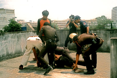 Construction worker Jong Jarapat, part of a crew making improvements at the Sri Mongkhon Bus Tour Company, threatened to end his life, because, he said, his boss was overworking him. Jong, who had been drinking in the hot sun, brandished an iron rod as a weapon to ward off anyone trying to save him. Police, unable to talk him down, were eventually able to distract him enough to pounce on him and abort his attempt to take his own life. |