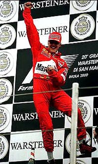 Schumacher raises a toast to his and his team’s victory at San Marino.