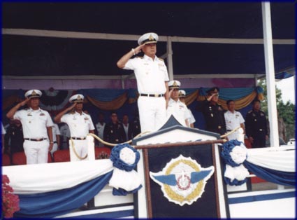 Commander receives heroic retirement sendoff Supreme Commander of the Royal Thai Armed Forces, General Mongkol Ampornpisit was given a full military retirement sendoff at the Naval Airbase in Rayong. The Supreme Commander of the Royal Thai Armed Forces, General Mongkol Ampornpisit was given a gallant retirement ceremony organized by the Commander of the Royal Thai Navy, Admiral Thira Haojaroen at the Naval Airbase in Rayong on August 30. General Mongkol Ampornpisit, who is retiring in October, was honored with a full-scale military assembly. Five battalions passed in review, followed by a parade of the Infantry, Armor, Anti-Aircraft, Transportation, Artillery, Marine Amphibious and Coastal Defense units. Naval warships and Air Force fighter jets also participated in the event, with aircraft passing overhead in tribute. General Mongkol commanded a number of infantry units during his career, with assignments in Vietnam, special missions suppressing communism in Thailand and other duties in Thai border areas. As Supreme Commander of the Royal Thai Armed Forces during the last four years of his career, the General played a vital role in supporting the Navy by pushing various programs to maintain the Navy’s readiness in defending the Kingdom. |