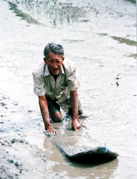 cockles, by hand, off the sea floor. Some 45 - 50 kilos are taken in a 7 - 10 hour outing and sell for around Baht 10 ($US 0.25) per kilo.