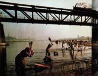 The panorama from the windows is a timeless scene of the human masses living out their daily lives. Men and women bathe and wash their clothes along a