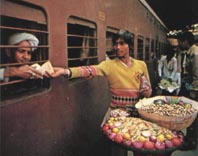 transistor radios. Hot, sweet tea will be served to you right where you sit. You must toss it down quickly and return the glass before the train pulls away. Even monkeys are