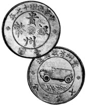 The first coin with a car comes from China, Kweichow Province. It was issued in 1928 to commemorate the first road in Kweichow. The coin is known as the Auto