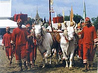 The Royal Ploughing Ceremony on May 16 signals the beginning of the planting season in Thailand. Two well cared for oxen of the same color pull an ancient