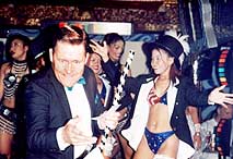 Probably the surprise of the night were the “show girls” who bumped and ground their way through such numbers as “American Pie” and “Latino Lover”. For once these were not the rather tall, surgically enhanced, “ladies” but were the girls normally seen as chrome pole huggers, who all gave well-rehearsed performances in the Corps de Ballet genre, with some of the dancers from Bubbles, Lipstick, Rodeo Girls and Planet Rock showing true Las Vegas style cabaret talents. They had become performers! Of course, cabaret nights would not be the same without the Ladies of the Second Category, all of whom danced their way through exotic routines, wearing even more exotic costumes, a goodly percentage of which managed to slip during the numbers, revealing their surgeon’s talents. Perhaps a press stud could also be inserted at the same time as the silicone, to enable their tops to remain attached! The dance routines were choreographed by Lek, assisted by Ms. Gop, who also played the Liza Minelli role, acting as a perfect foil for David Smith. The One Million Dollar notes that were thrown to the crowd during the “Money makes the world go round” number were another great promotional idea, though Dr. Iain (Nite Beat, Pattaya Mail Channel) advised young David Smith after the finale not to spend all his money in the Katoey Shop. Planet Rock has now certainly elevated itself within the chrome pole wonderland of Soi Pattayaland 2 to become a true nightclub with their best show yet. These are to be a monthly event and Pattaya is waiting to see what Mickey Rooney will do next.
