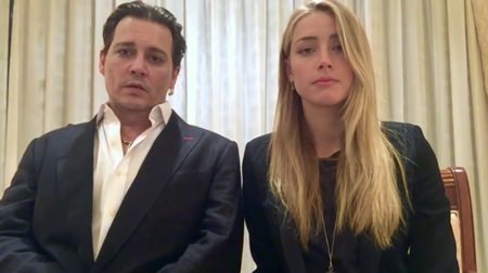 Actor Johnny Depp (left) and his wife, Amber Heard speak in a videotaped apology presented at a court case in which Heard was charged with trying to smuggle the couple’s dogs into Australia last year. (Australian Government via AP Video)