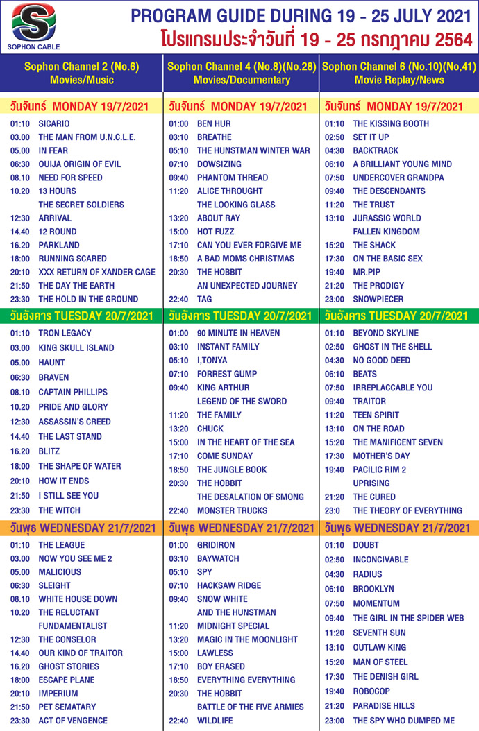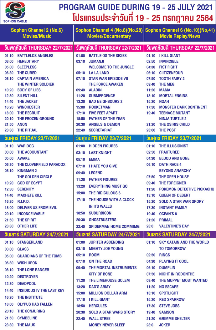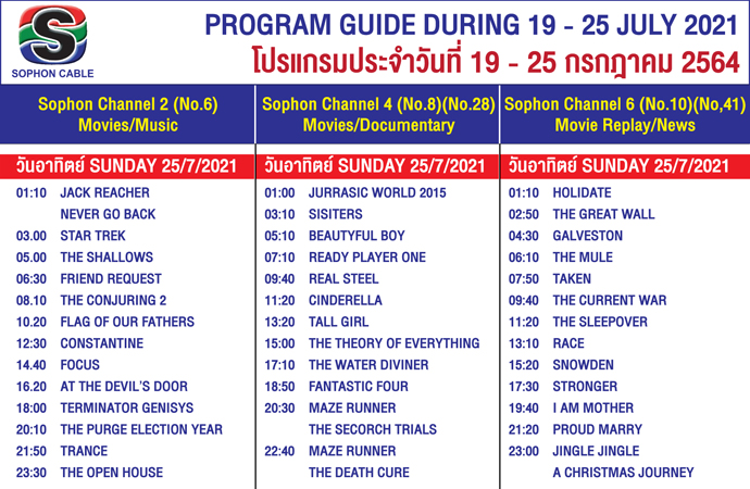 Arts & CultureDaily NewsletterTV GuideWhat's On in Pattaya-Thailand Sophon Cable TV Guide 19 – 25 July, 2021 By Pattaya Mail July 19, 2021 0 2968 Share on Facebook Tweet on Twitter tweet