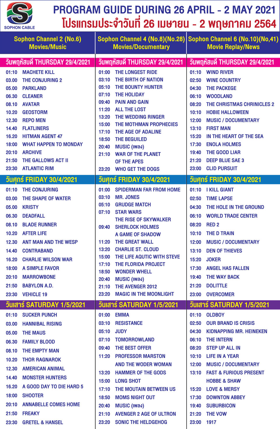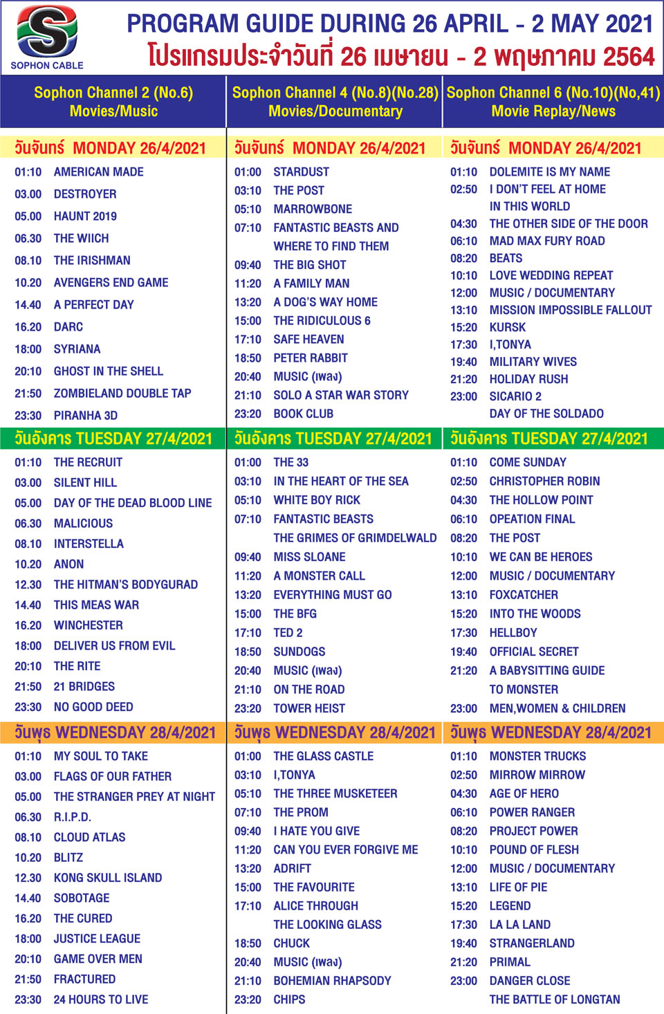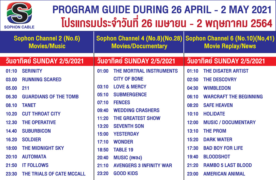 Arts & CultureTV GuideWhat's On in Pattaya-Thailand Sophon Cable TV Guide 26 April – 2 May, 2021 By Pattaya Mail April 26, 2021 0 3002 Share on Facebook Tweet on Twitter tweet