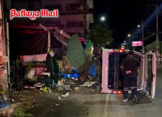 PATTAYA, Thailand – Rescue workers from the Sawang Boriboon responded to a report of a van crashing into a residential property along Khao Noi...