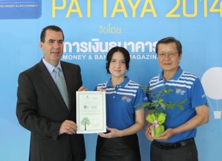 Antonello Passa (left), General Manager of the Royal Cliff Hotels Group presents a ‘Tree Planting Certificate’ to Parita Viriyarangsarit (middle), Vice President of...