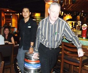 General Manager Cathel Brett and staff carry in a beer keg for the Oktoberfest party. Beautiful fraulines prepare to quench their thirst...