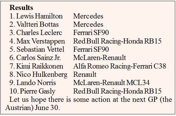 Lewis Hamilton (Mercedes) ran away and hid, leading every lap and setting fastest laps as well. In his wake was his team mate Valtteri Bottas, who remained in second place and 18 seconds in arrears for the duration and was never in the leadership hunt, but stayed safely in front of third placed Charles Leclerc (Ferrari).