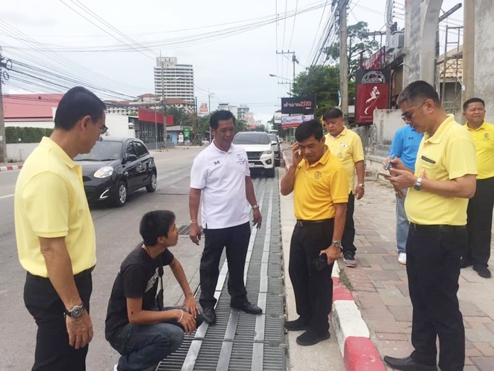 Deputy Mayor Pattana Boonsawad inspected the busy street at the Mum Aroi restaurant intersection July 4 which suffers chronic flooding. The city dredged drainage channels on side of the road and covered the drainage ways with steel grates.