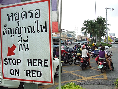 No one stops for red lights at Pattaya’s dozens of pedestrian crossings and everyone ignores zebra crossings and the red-and-white no-parking curb painting. So it should surprise no one that drivers also pay no heed to yellow-painted crosses on the pavement meant to prevent cars from blocking traffic.