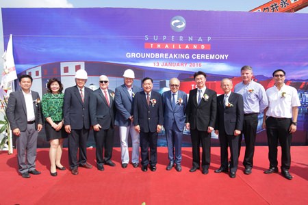 SUPERNAP International CCO David Blumanis (5th from left), SUPERNAP Thailand Chairman Deepak Sarup (5th from right) and Managing Director Dr. Amarit Laorakpong (3rd from left) welcome Chonburi Deputy Governor Phawat Lertmukhda (center), executives from its partners including True IDC General Manager Thanasorn Jaidee (left), Kasikorn Bank FSVP, System Division Chayathip Chuvanichanon (2nd from left), and CPB Equity Legal Manager Piyasak Bhumichitra (right) and executives from Thai Obayashi, Hemaraj Industrial Estate and Azure Development Group at the SUPERNAP Thailand groundbreaking ceremony.