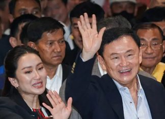 Ex-Premier Thaksin greets supporters at Pheu Thai Party headquarters