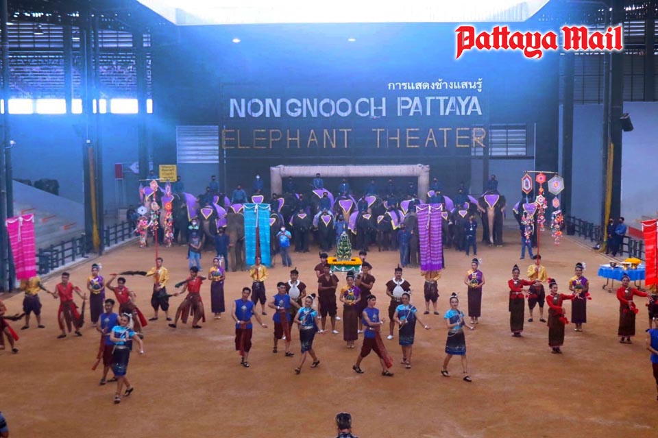 A herd of 20 elephants stand guard as entertainers perform the “Isan Muanchuen” songs and dances to welcome the new jumbo babies.