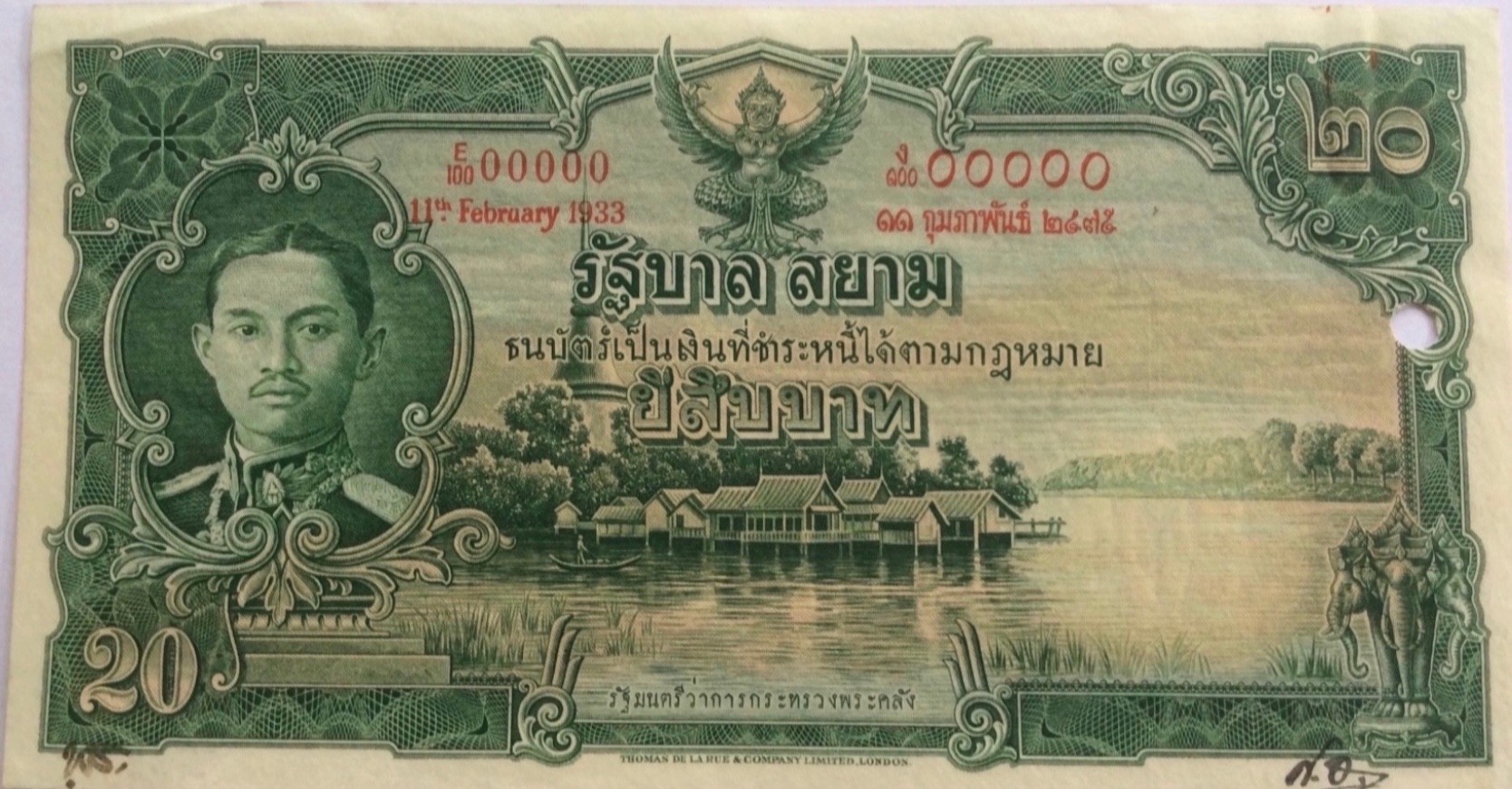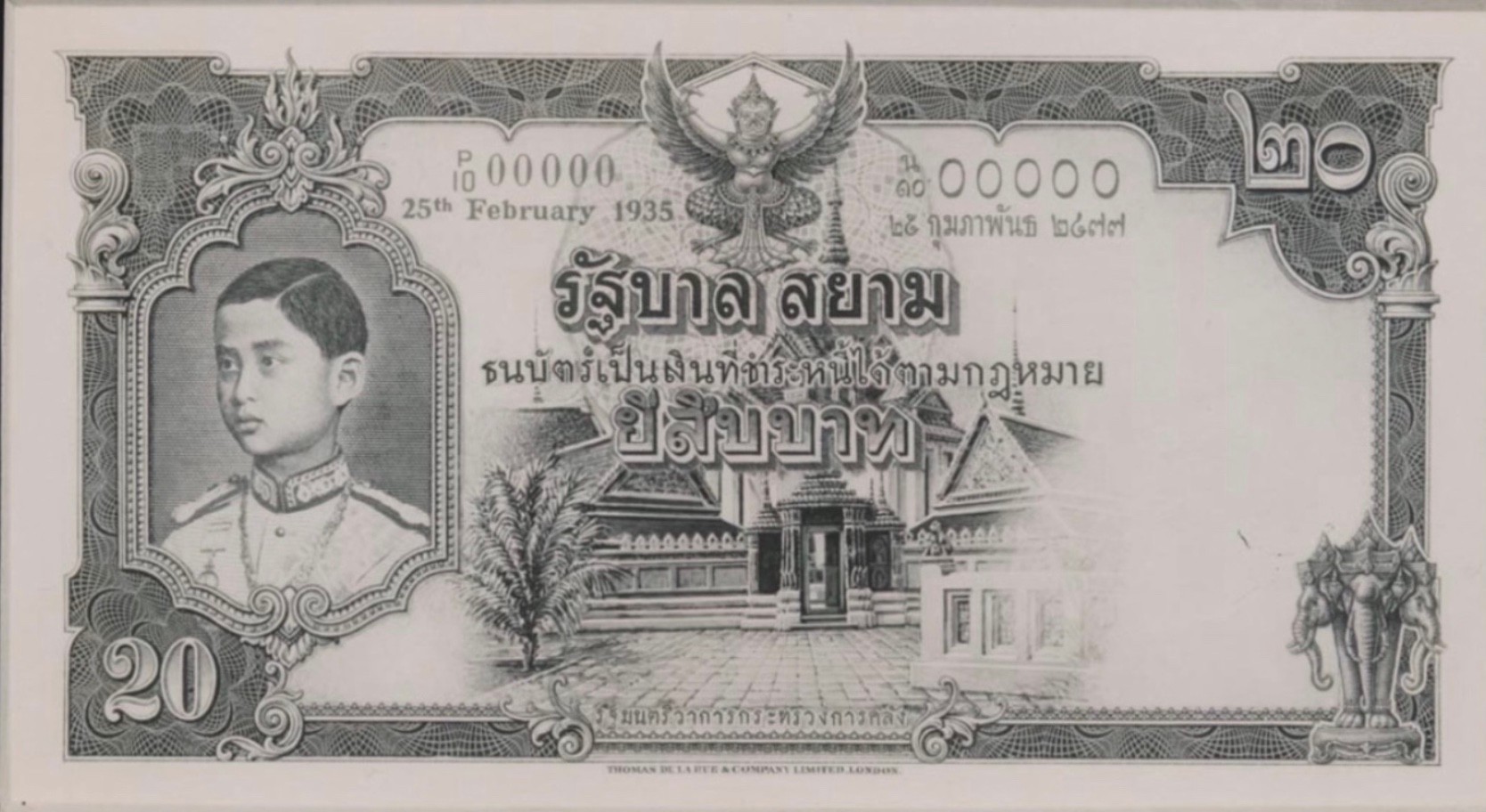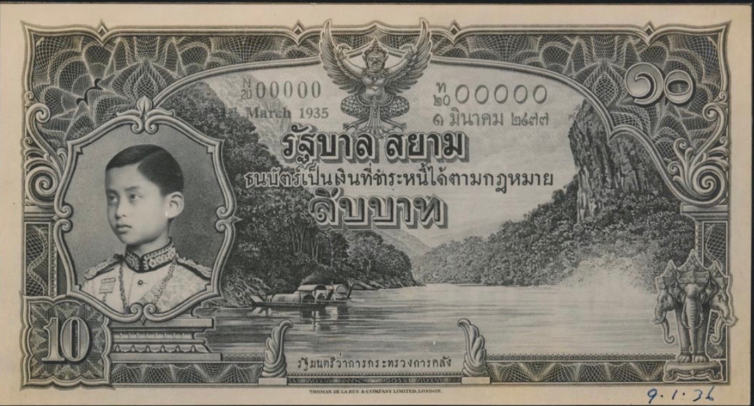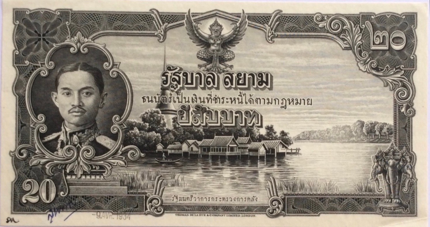 On January 18, 1936, the Ministry of Finance asked TdlR to try their utmost to ship the 10 Baht banknotes with the new portrait within 4 months. The 10 Baht was initialled as approved by the Siamese Minister to the United Kingdom H.E. Phya Rajawangsan on April 7, 1936 and announced on August 13, 1936. The 1- and 5 Baht was also announced in 1936, while the 20 Baht was first announced on December 15, 1937. These four denominations were initialled as approved by the Siamese Minister to the United Kingdom H.E. Phya Rajawangsan.