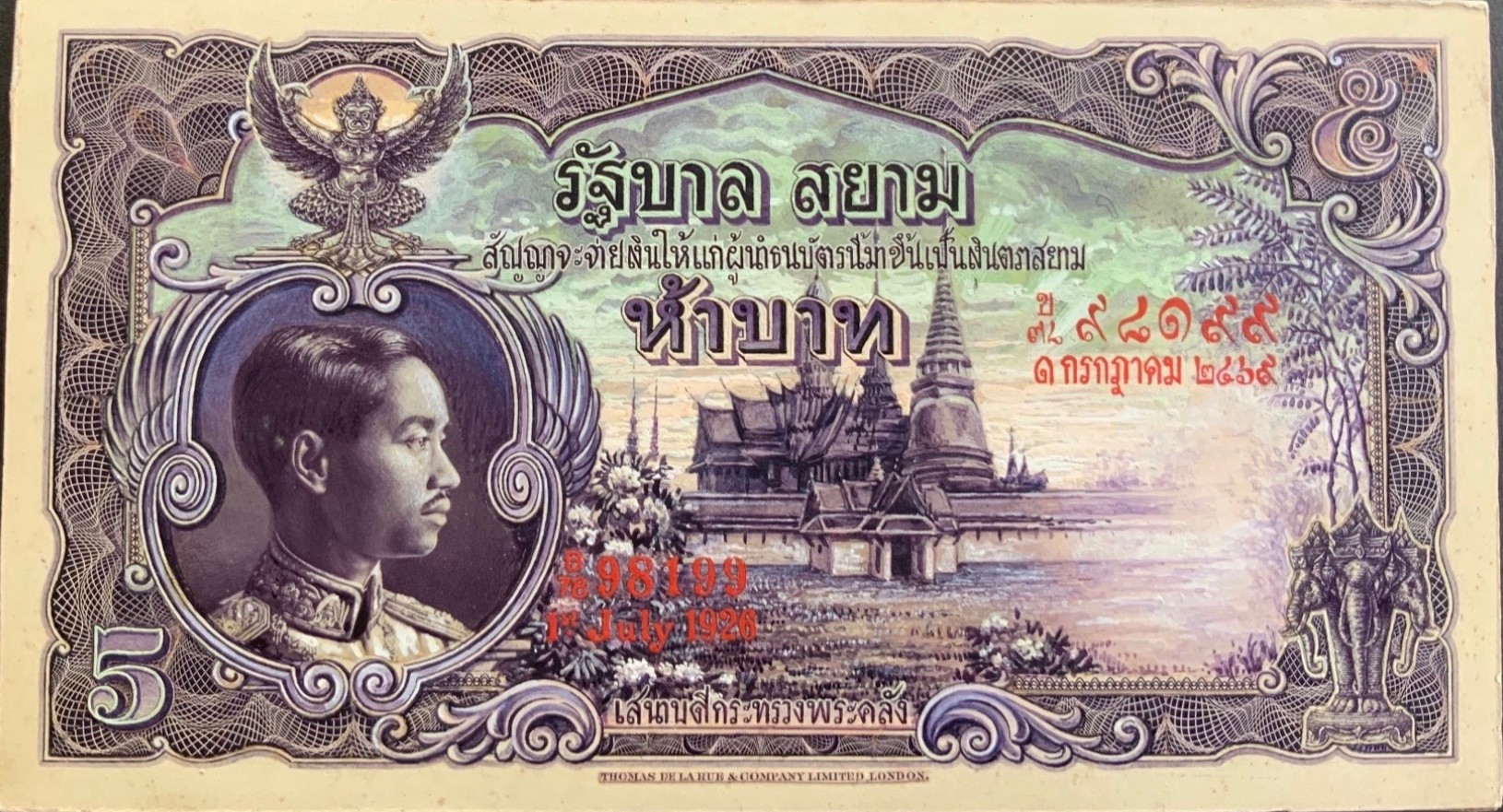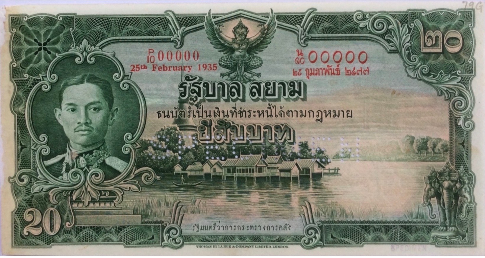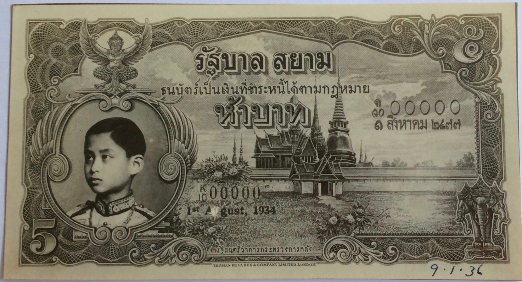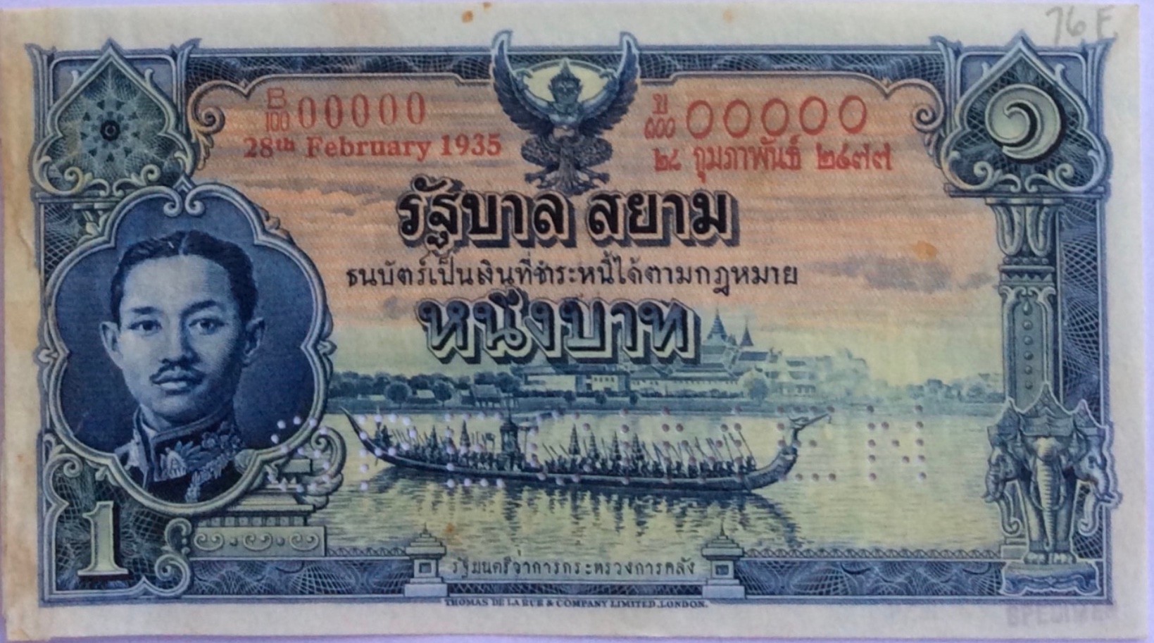 On January 18, 1936, the Ministry of Finance asked TdlR to try their utmost to ship the 10 Baht banknotes with the new portrait within 4 months. The 10 Baht was initialled as approved by the Siamese Minister to the United Kingdom H.E. Phya Rajawangsan on April 7, 1936 and announced on August 13, 1936. The 1- and 5 Baht was also announced in 1936, while the 20 Baht was first announced on December 15, 1937. These four denominations were initialled as approved by the Siamese Minister to the United Kingdom H.E. Phya Rajawangsan.
