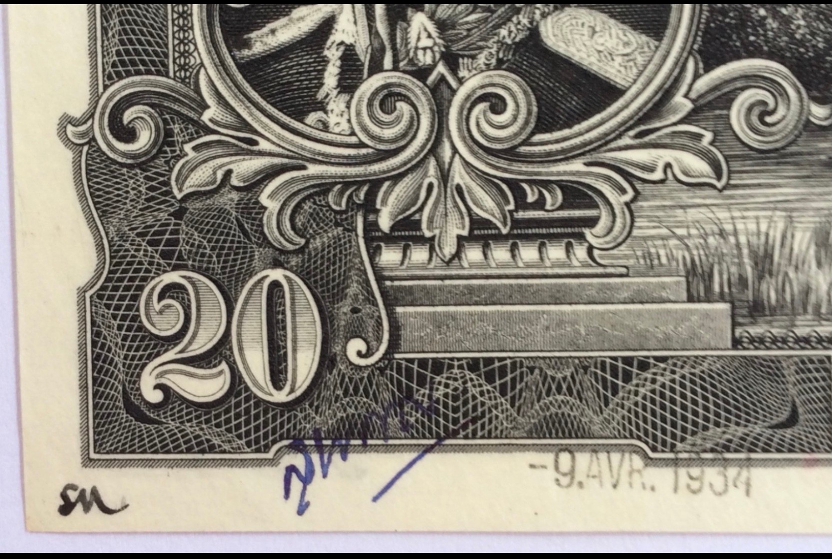 The change was done by photogravure and accepted by His Majesty and printed for circulation. This specimen 20 Baht banknote Third Series, Type I, is initialled as approved by Royal Ministry of Finance.