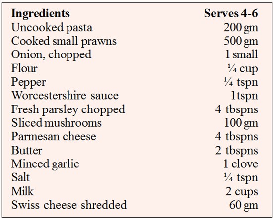 Pasta is always a good dish to prepare when entertaining. A central large bowl with the special pasta spoon (you do have one?) can be used as a main course, or as an entree. You can substitute the prawns with crab or even a white meat fish. Do not overcook the prawns as it makes them rubbery.