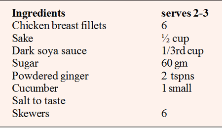 Mix sake, soya sauce and sugar and pour into a wide flat bowl.  Lay skewered chicken in the marinade for five minutes, then turn over and leave for another five minutes.