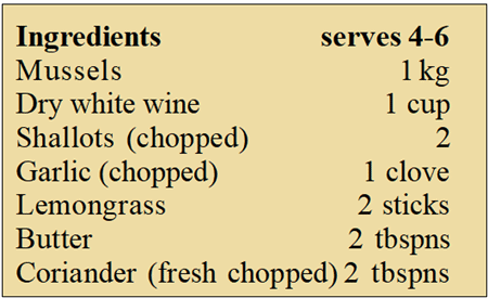This is a very simple recipe which will produce a gourmet restaurant dish to surprise your friends.  The greatest amount of time should be spent in making sure the mussels are cleaned and prepared properly.  The golden rule for all kinds of seafood is “If in doubt – throw it out!”