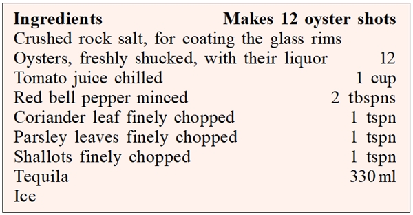 Crush the rock salt and moisten the rims of 12 shot glasses with water, then dip each glass in the salt to coat the rims. Put an oyster into each shot glass.